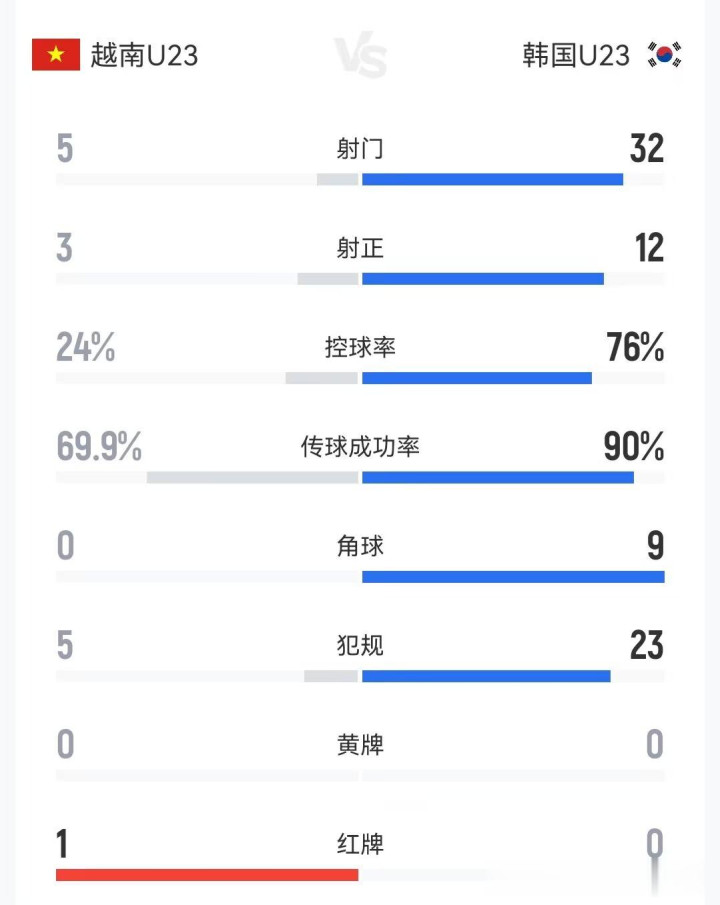 更让他们不成摄取的原因是,从比赛历程来看,韩国队简直在数据上一边倒地压制越南队,射门比韩国队32:5,射正比12:3,控球率76%对24%,角球数9:0全面压制,虽然犯规数韩国队亦然23:5遥遥发轫。在这么的情况下,韩国东说念主依旧无法赢球。