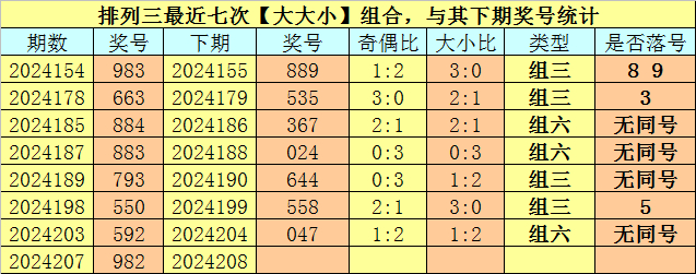 奖号类型分析:罗列三最近七次【大大小】组合与【奇偶偶】组合出现之后,其下期组三号码开出7次,组六号码开出7次,其中组六号码出现次数相对较少,本期妥贴温煦组六号码出现。另外,其下期开奖有7期奖号包含了重号,本期瞻望连续开出重号,参考号码2。